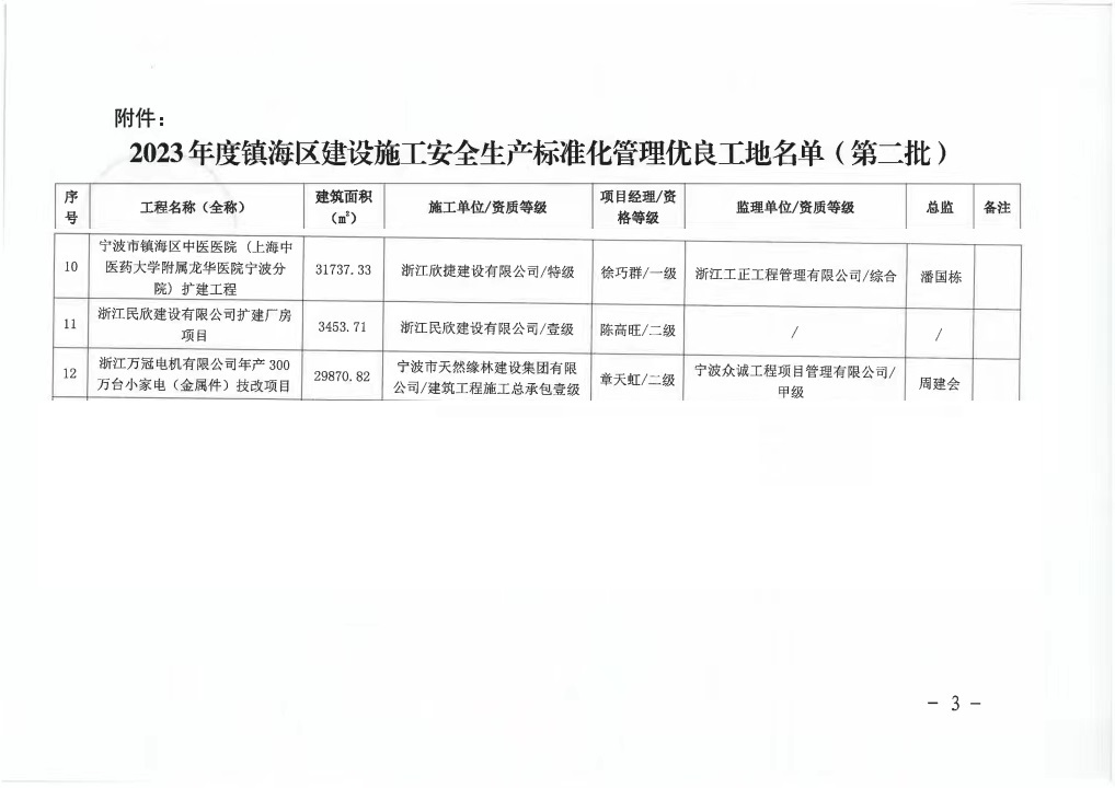 12月5日,寧波市鎮(zhèn)海區(qū)住房和城鄉(xiāng)建設(shè)交通局發(fā)布《關(guān)于公布2023年度鎮(zhèn)海區(qū)建設(shè)施工安全生產(chǎn)標(biāo)準(zhǔn)化管理優(yōu)良工地獲獎(jiǎng)工程》文件通知,由我眾誠(chéng)工程公司監(jiān)理的浙江萬(wàn)冠電機(jī)有限公司年產(chǎn)300萬(wàn)臺(tái)小家電整機(jī)(金屬件)技改項(xiàng)目獲得“2023年度建筑施工安全生產(chǎn)標(biāo)準(zhǔn)化工地”榮譽(yù)稱號(hào)。