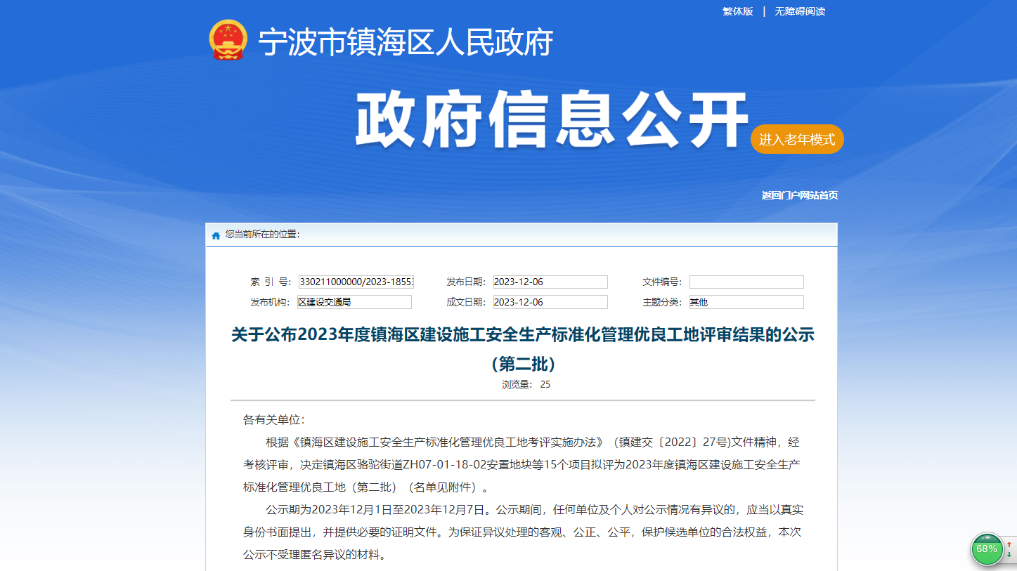 我公司項(xiàng)目榮獲鎮(zhèn)海區(qū)安全生產(chǎn)標(biāo)準(zhǔn)化管理榮譽(yù)