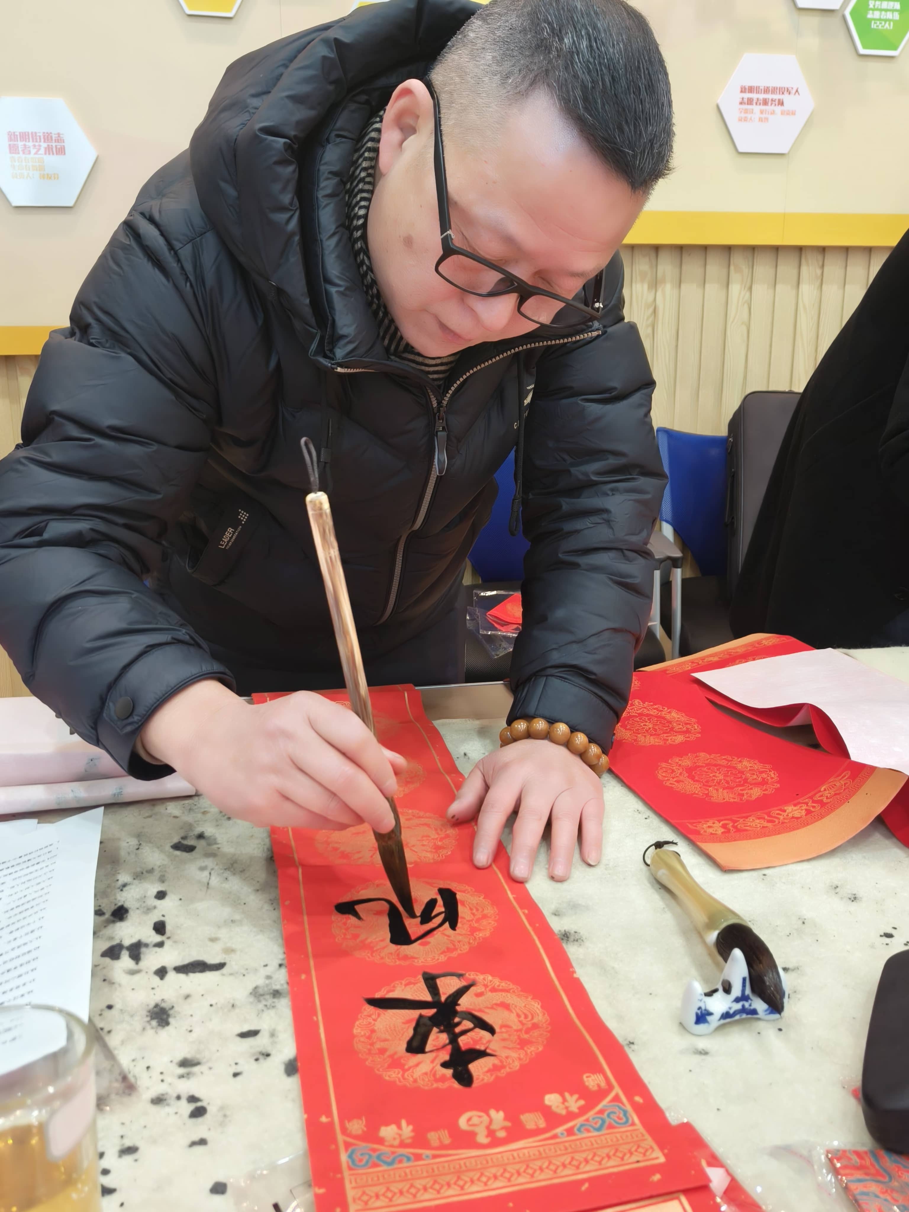 在活動(dòng)的精彩環(huán)節(jié),書法家們滿懷熱情,揮毫潑墨,創(chuàng)作出一個(gè)個(gè)充滿神韻的“?!弊趾驮⒁饧榈拇郝?lián)。這些滿載祝福的藝術(shù)作品,不僅是對(duì)中華優(yōu)秀傳統(tǒng)文化的傳承,更是對(duì)美好幸福生活的向往。主辦方將這些作品送到社區(qū)群眾和10位最美志愿者手中。